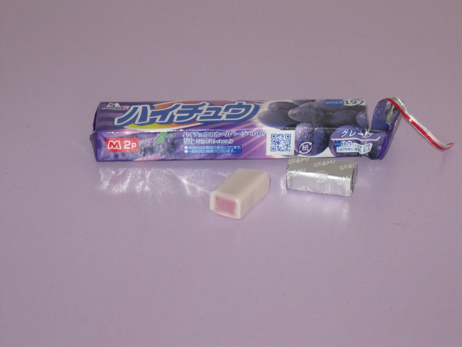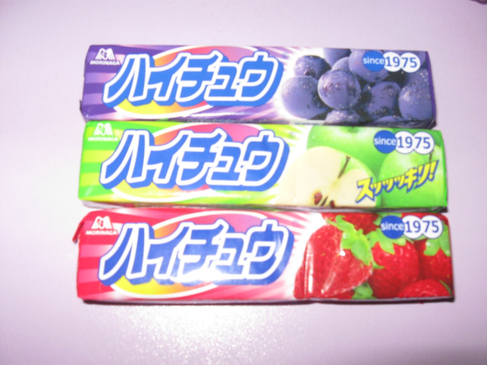 What is Hi-chew?Well...it's an awesome chewy candy with fruit flavors(usually) which you chew for a long time and it doesn't stick on your teeth!Awesome,eh?They have so many flavors in Japan ^^.But for now this is what I've tried--->